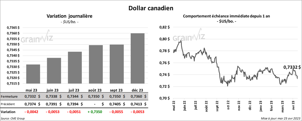 Les contrats de soya US aux échéances les plus rapprochées ont terminé la journée en recul entre 15 ¾ et 20 cents. Ceux de tourteau de soya US aux échéances les plus rapprochées ont également fini dans le rouge entre 2,40 et 4,70 $/tonne. Les contrats d’huile de soya US aux échéances les plus rapprochées ont fermé avec des pertes entre 62 et 85 points.
