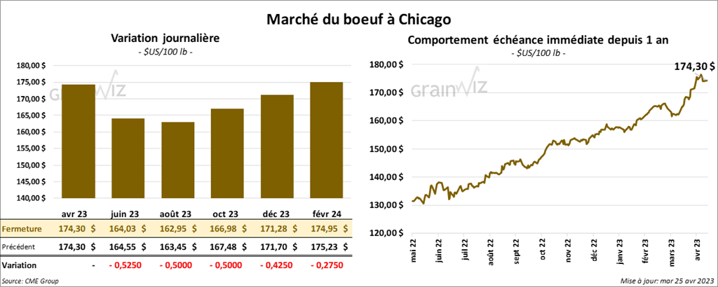 Les contrats de bœuf US aux échéances les plus rapprochées ont terminé la session en baisse entre 50 et 52 cents. Celui avril 23 a fait exception en restant au neutre. Les contrats de veau US aux échéances les plus rapprochées ont également fini dans le rouge entre 47 cents et 1,32 $. Celui août 23 a fait exception en fermant en progression par 17 cents.