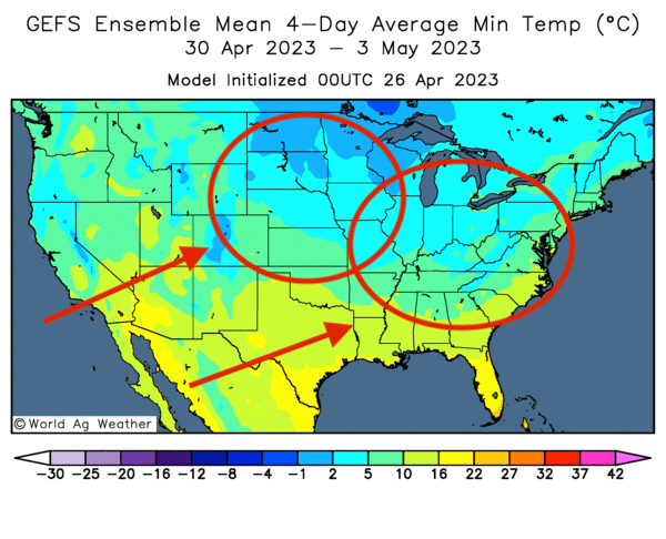 - World Weather note aussi que les températures seront plus froides que la normale à court et à moyen terme pour le Delta du Mississippi, les Plaines US et certaines parties du Midwest (Corn Belt).