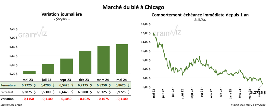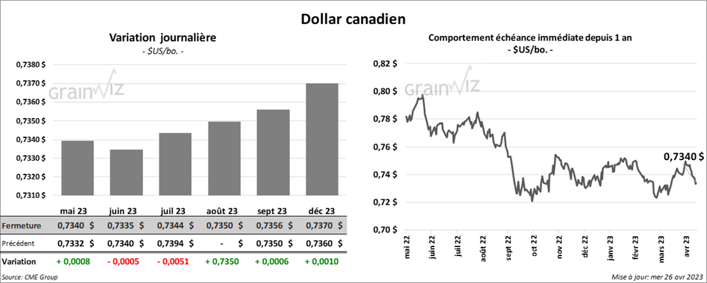 - Concernant le rapport de Statistique Canada, les agriculteurs canadiens prévoient semer du blé 2023 sur 27,0 millions d’acres, ce qui correspondrait à une augmentation annuelle de 6,2 %. Il s’agirait en fait d’un sommet des 20 dernières années. Cette hausse serait attribuable aux prix intéressants et à la forte demande. La guerre en Ukraine et le temps sec dans le centre et le sud des Plaines US seraient également à considérer.