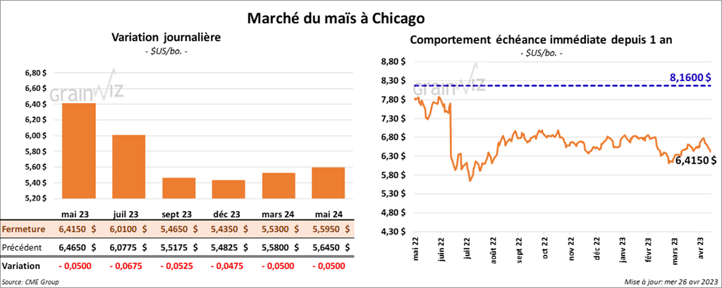 Les contrats de maïs US aux échéances les plus rapprochées ont terminé la journée en baisse entre 5 et 6 ¾ cents.