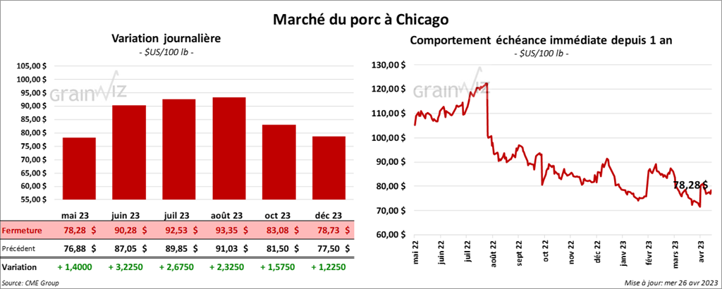 - Le 24 avril dernier, le CME Lean Hog Index était en hausse de 2 cents à 71,20 $.
