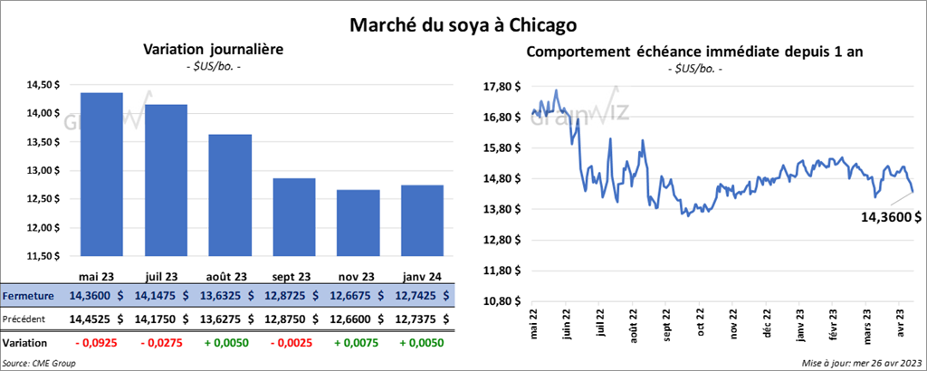 Les contrats de soya US aux échéances les plus rapprochées ont fermé en recul entre 2 ¾ et 9 ¼ cents. Celui août 23 a fait exception en clôturant dans le vert par 5 cents. Les contrats de tourteau de soya US aux échéances les plus rapprochées ont fini dans le rouge entre 6,10 et 8,80 $/tonne. Ceux d’huile de soya US aux échéances les plus rapprochées ont fait l’inverse en terminant dans le vert entre 36 et 37 points.