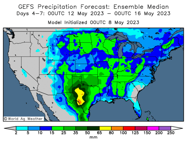- Cette carte US, fournie par World Ag Weather et dessinée pour les 4 à 7 prochains jours, montre des précipitations à l’ensemble des Plaines US, du Midwest et du sud-est US (voir notamment les zones vertes).