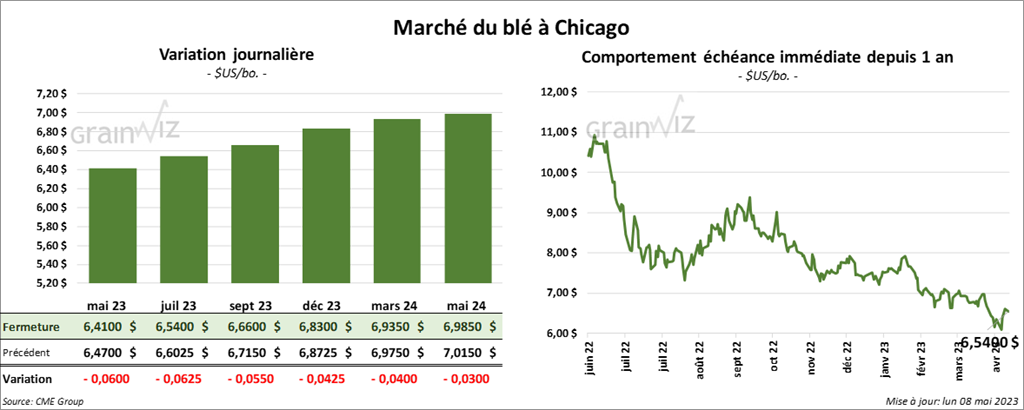 À Chicago, les contrats de blé US aux échéances les plus rapprochées ont clôturé dans le rouge entre 5 ½ et 6 ¼ cents. À Kansas, ceux de blé dur rouge aux échéances les plus rapprochées ont fini dans le vert entre 10 ¼ et 11 ¼ cents. À Minneapolis, les contrats de blé de printemps aux échéances les plus rapprochées ont terminé en hausse entre 7 et 8 cents.