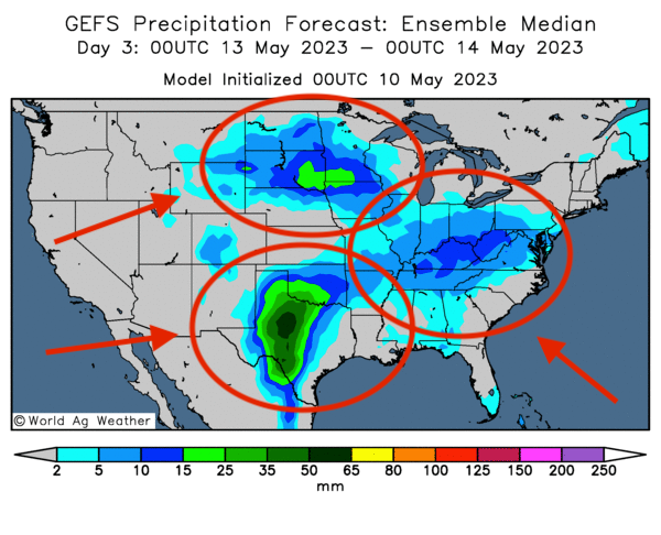 - Cette carte US, fournie par World Ag Weather et dessinée pour les 3 prochains jours, indique des possibilités d’averses pour une bonne partie des Plaines US (à l’exception du centre), du Midwest et du sud-est US.