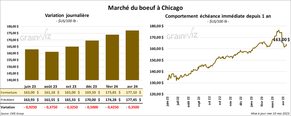 - Le 9 mai dernier, le CME Feeder Cattle Index était en hausse de 3 cents à 199,45 $.