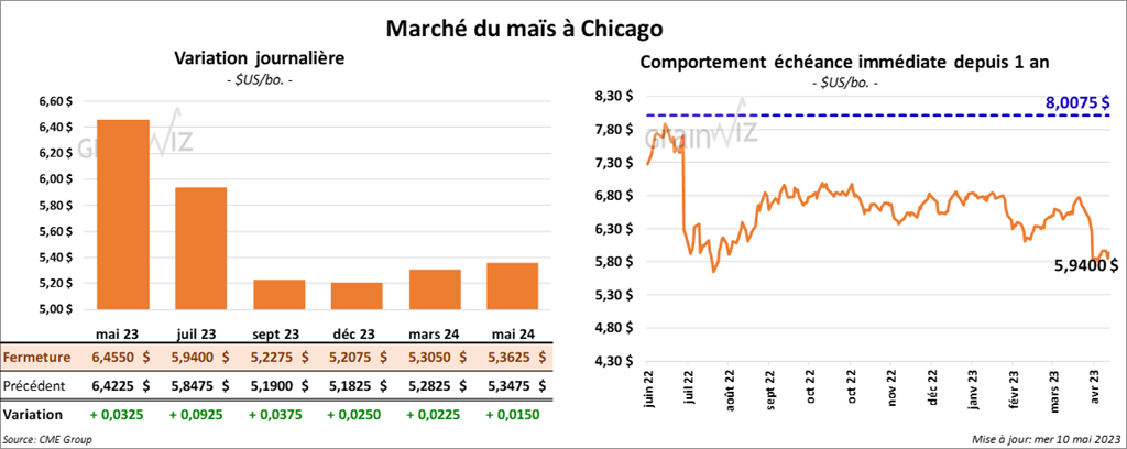 Les contrats de maïs US aux échéances les plus rapprochées ont terminé la séance en progression entre 3 ¾ et 9 ¼ cents.