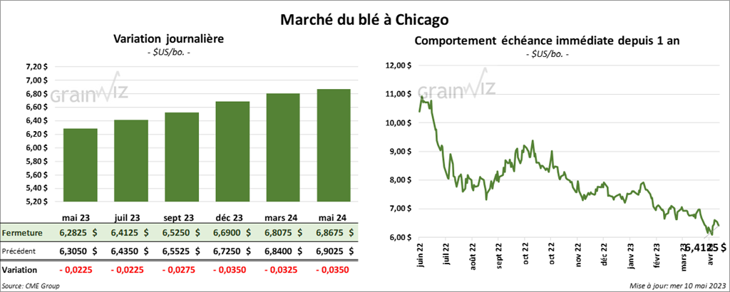 À Chicago, les contrats de blé aux échéances les plus rapprochées ont clôturé en baisse entre 2 ¼ et 2 ¾ cents. À Kansas, ceux de blé dur rouge aux échéances les plus rapprochées ont également terminé en recul entre ½ et 1 cent. À Minneapolis, les contrats de blé de printemps aux échéances les plus rapprochées ont fini avec des gains entre 1 ¾ et 2 ¼ cents.