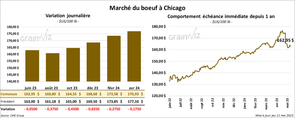 Les contrats de bœuf US aux échéances les plus rapprochées ont fini la session en baisse entre 5 et 45 cents. Ceux de veau US aux échéances les plus rapprochées ont fait l’inverse en clôturant dans le vert par 92 cents. Celui mai 23 a fait exception en terminant en recul par 1,25 $.