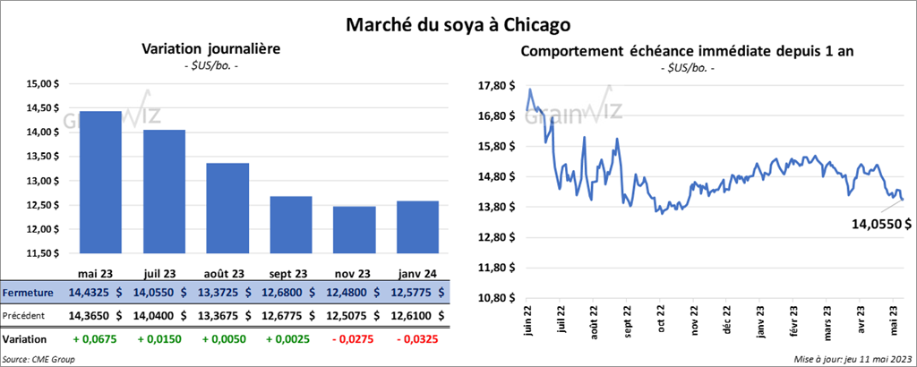 Les contrats de soya US aux échéances les plus rapprochées ont fermé en hausse entre ½ et 6 ¾ cents. Ceux de tourteau de soya US aux échéances les plus rapprochées ont également fini dans le vert entre 8,70 et 11,90 $/tonne. Les contrats d’huile de soya US aux échéances les plus rapprochées ont fait l’inverse en terminant dans le rouge entre 90 et 94 points.