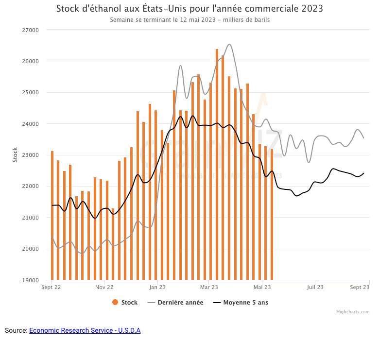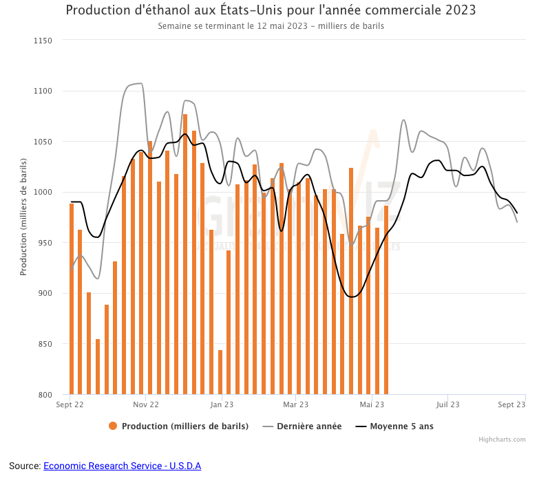 Pour la semaine du 12 mai dernier, l’EIA a estimé la production moyenne d’éthanol US à 987,000 barils par jour, ce qui était une hausse de 2,3 % comparativement à la semaine précédente et une baisse de 0,4 % par rapport à l’an passé. Les attentes des analystes étaient moins élevées. Au total, 6,909 millions de barils ont été produits. 99,2 millions de boisseaux de maïs ont été utilisés dans la fabrication de l’éthanol US.