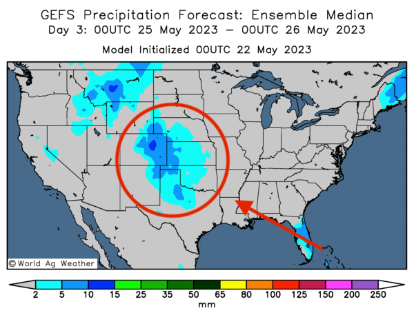 - Cette carte US, fournie par World Ag Weather et dessinée pour les 3 prochains jours, montre des averses possibles dans le centre des Plaines US.