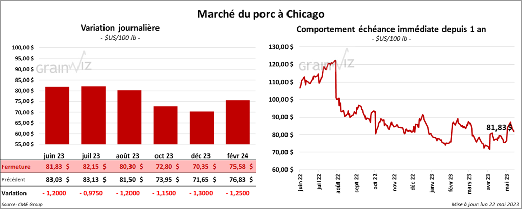 - Le 18 mai dernier, le CME Lean Hog Index était en hausse de 71 cents à 79,13 $.