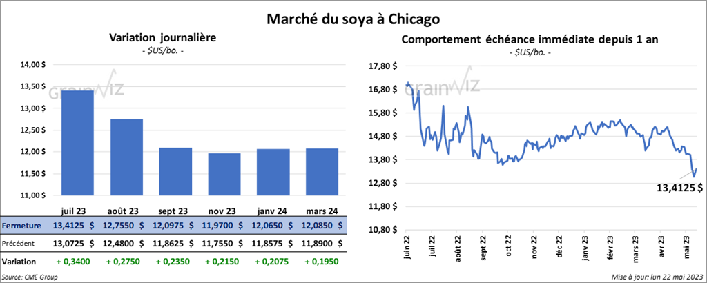 Les contrats de soya US aux échéances les plus rapprochées ont terminé la session en hausse entre 23 ½ et 34 cents. Ceux de tourteau de soya US aux échéances les plus rapprochées ont également fermé dans le vert entre 3,10 et 3,40 $/tonne. Les contrats d’huile de soya US aux échéances les plus rapprochées ont fini en progression entre 144 et 150 points.