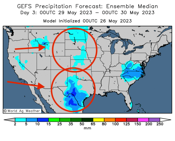 - Cette carte US, fournie par World Ag Weather et dessinée pour les 3 prochains jours, montre des possibilités d’averses légères dans certaines parties des Plaines US. Elle indique également que les pluies seront probablement plus abondantes dans le sud des Plaines US, au Texas.