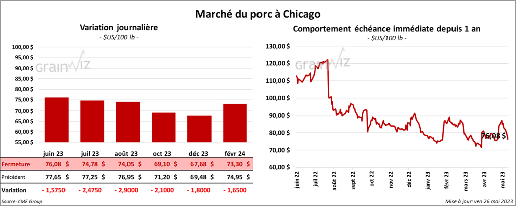Les contrats de porc US aux échéances les plus rapprochées ont fini dans le rouge entre 1,57 et 2,90 $.