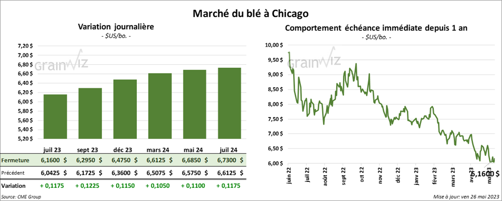À Chicago, les contrats de blé aux échéances les plus rapprochées ont fini la journée en hausse entre 11 ½ et 12 ¼ cents. À Kansas, ceux de blé dur rouge aux échéances les plus rapprochées ont également terminé en progression entre 1 ¼ et 3 cents. À Minneapolis, les contrats de blé de printemps aux échéances les plus rapprochées ont clôturé avec des gains entre 9 ¼ et 12 ½ cents.