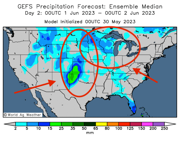- Cette carte US, fournie par World Ag Weather, dessinée pour les 2 prochains jours, montre les possibilités d’averses plus élevées pour les Plaines US et le haut Midwest (voir les zones bleues et vertes). Elle indique aussi un temps ensoleillé dans l’est du Corn Belt (voir les zones grises visibles à droite sur la carte, près des Grands Lacs).