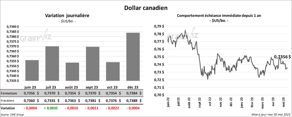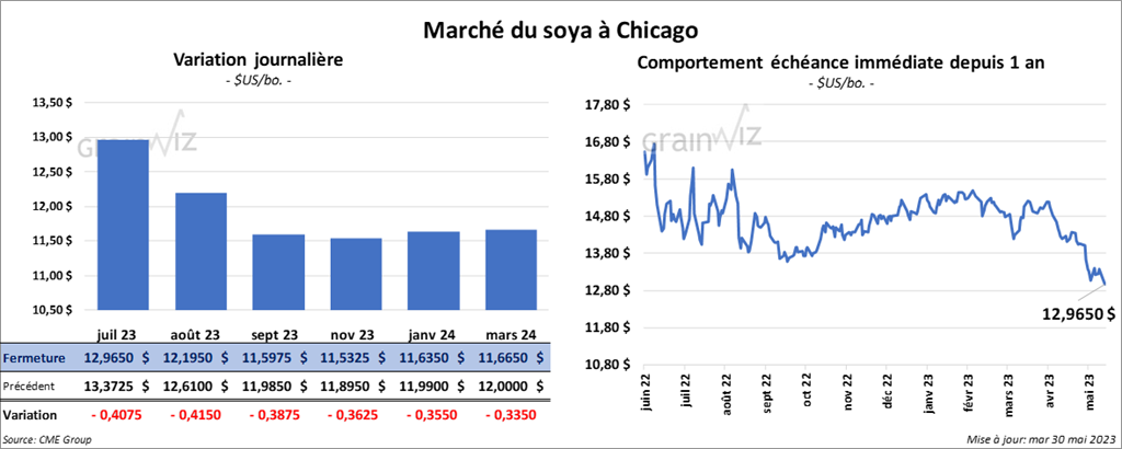 Les contrats de soya US aux échéances les plus rapprochées ont clôturé avec des pertes entre 38 ¾ et 40 ¾ cents. Ceux de tourteau de soya US aux échéances les plus rapprochées ont également terminé dans le rouge entre 9,30 et 9,70 $/tonne. Les contrats d’huile de soya US aux échéances les plus rapprochées ont fini la séance en recul entre 257 et 262 points.