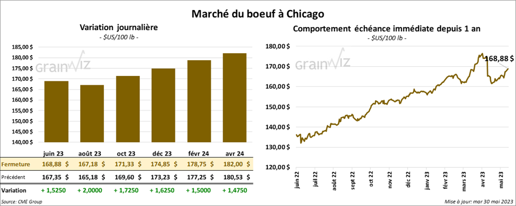 Les contrats de bœuf US aux échéances les plus rapprochées ont fini la séance en hausse entre 1,52 et 2,00 $. Ceux de veau US aux échéances les plus rapprochées ont également terminé avec des gains entre 3,45 et 3,85 $.
