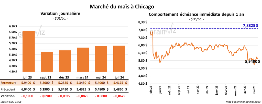 Les contrats de maïs US aux échéances les plus rapprochées ont fini la journée en baisse entre 9 et 10 cents.