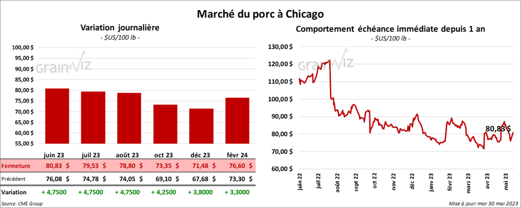 - Le 25 mai dernier, le CME Lean Hog Index était en baisse de 32 cents à 80,48 $.