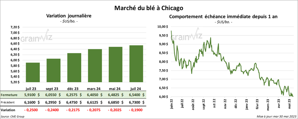 À Chicago, les contrats de blé aux échéances les plus rapprochées ont terminé la session en baisse entre 21 ¾ et 25 cents. À Kansas, ceux de blé dur rouge aux échéances les plus rapprochées ont fini en recul entre 30 ¾ et 35 ½ cents. À Minneapolis, les contrats de blé de printemps aux échéances les plus rapprochées ont fermé dans le rouge entre 24 ½ et 25 cents.