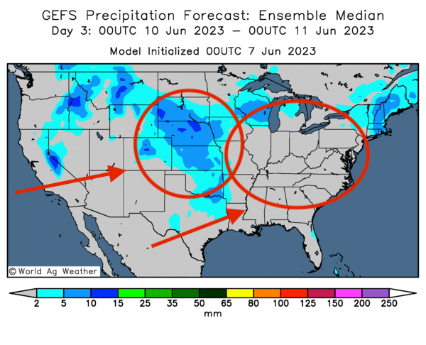 - Cette carte US, fournie par World Ag Weather et dessinée pour les 3 prochains jours, montre notamment des averses probables dans le centre des Plaines (voir les zones bleues encerclées) et un temps sec possible dans l’est du Corn Belt (voir les zones grises encerclées).