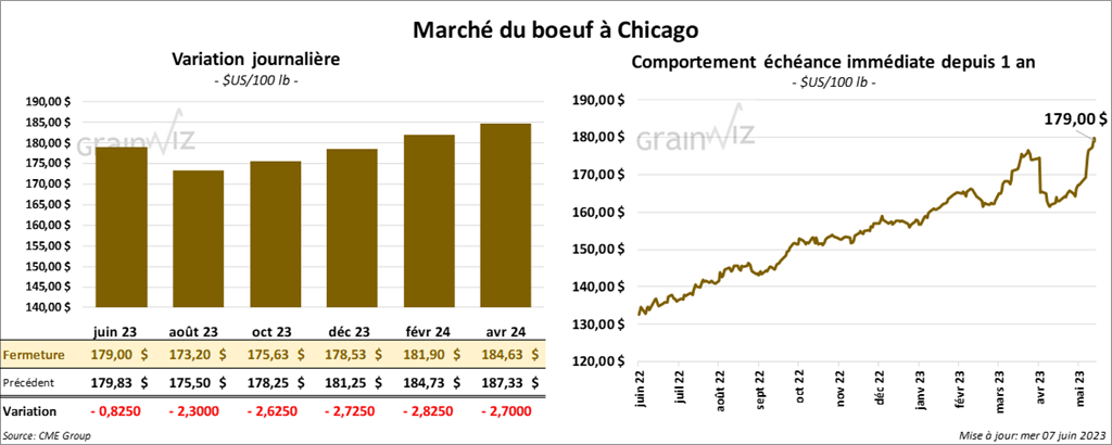 Les contrats de bœuf US aux échéances les plus rapprochées ont fermé en baisse entre 82 cents et 2,62 $. Ceux de veau US aux échéances les plus rapprochées ont également fini avec des pertes entre 4,15 et 4,27 $.