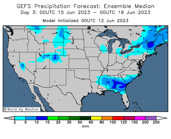 - World Weather anticipe à court et à moyen terme des précipitations inférieures à la normale pour une bonne partie du Midwest (Corn Belt). L’organisme prévoit également des averses limitées et un retour des températures élevées à partir de la semaine prochaine pour les Plaines US et l’ouest du Midwest.