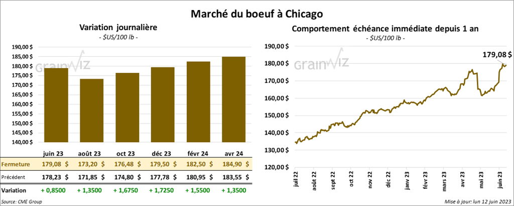 - Le 9 juin dernier, le CME Feeder Cattle Index était en hausse de 1,81 $ à 227,99 $.