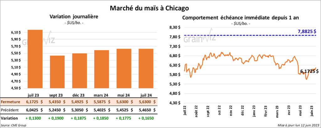 Les contrats de maïs US aux échéances les plus rapprochées ont terminé la session en hausse entre 13 et 19 cents.
