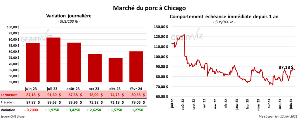 Les contrats de porc US aux échéances les plus rapprochées ont fini la séance en progression entre 1,97 et 3,42 $. Celui juin 23 a fait exception en terminant dans le rouge par 70 cents.