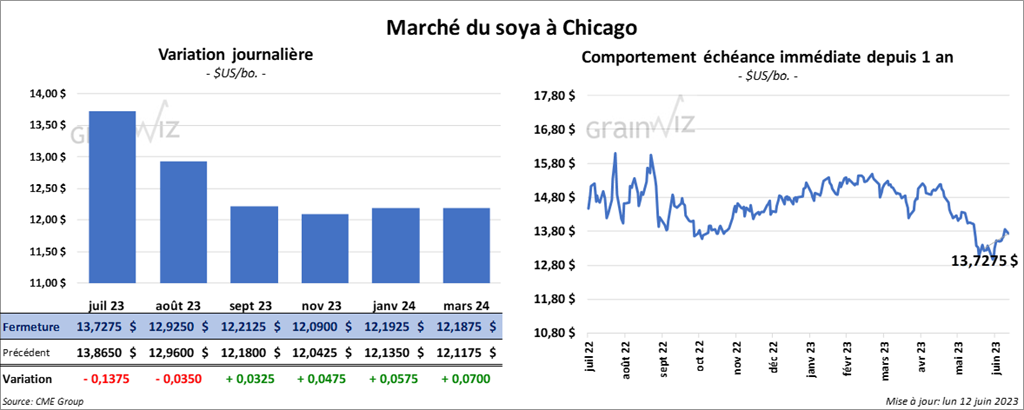 Les contrats de soya US aux échéances les plus rapprochées ont fini la journée en baisse entre 3 ½ et 13 ¾ cents. Celui septembre 23 a fait exception en fermant en hausse par 3 ¼ cents. Les contrats de tourteau de soya US aux échéances les plus rapprochées ont clôturé en progression entre 20 cents et 1,10 $/tonne. Ceux d’huile de soya US aux échéances les plus rapprochées ont fait l’inverse en terminant en baisse entre 43 et 61 points.