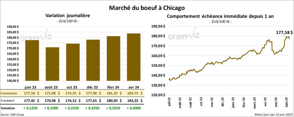 Les contrats de bœuf US aux échéances les plus rapprochées ont terminé la journée en progression entre 10 et 22 cents. Ceux de veau US aux échéances les plus rapprochées ont fait l’inverse en finissant en recul entre 140 et 1,77 $.