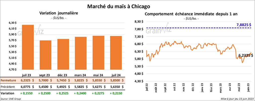 Les contrats de maïs US aux échéances les plus rapprochées ont clôturé avec des gains entre 15 ½ et 25 ¼ cents.