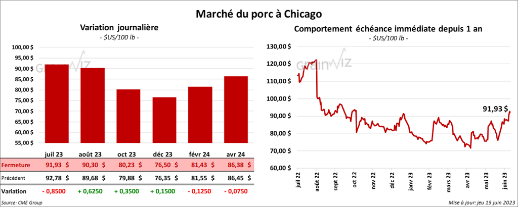 Les contrats de porc US aux échéances les plus rapprochées ont fini la séance en progression entre 35 et 62 cents. Celui juillet 23 a fait exception en terminant dans le rouge par 85 cents.