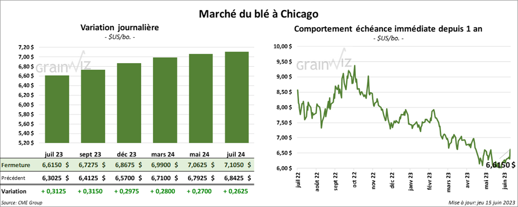 À Chicago, les contrats de blé aux échéances les plus rapprochées ont fini la séance en hausse entre 29 ¾ et 31 ½ cents. À Kansas, ceux de blé dur rouge aux échéances les plus rapprochées ont également terminé en progression entre 26 ¼ et 27 cents. À Minneapolis, les contrats de blé de printemps aux échéances les plus rapprochées ont fermé avec des gains entre 23 ½ et 25 ¾ cents.