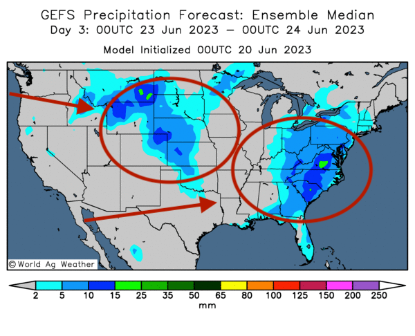 - Cette carte US, fournie World Ag Weather et dessinée pour les 3 prochains jours, montre notamment un temps pluvieux limité dans le centre des Plaines US et l’est US.