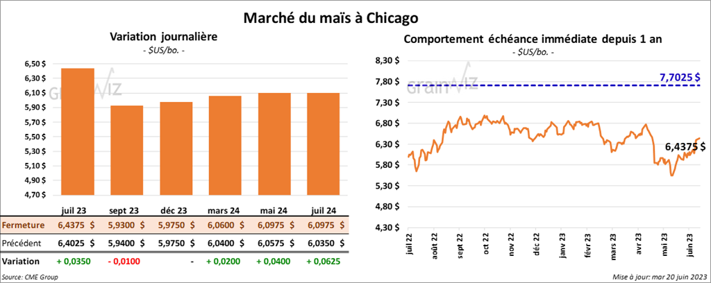 Le contrat de maïs US juillet 23 a terminé à 6,4375 $ (+ 3 ½ cents). Celui septembre 23 a clôturé à 5,9300 $ (-1 cent) et celui décembre 23 à 5,9750 $ (--).