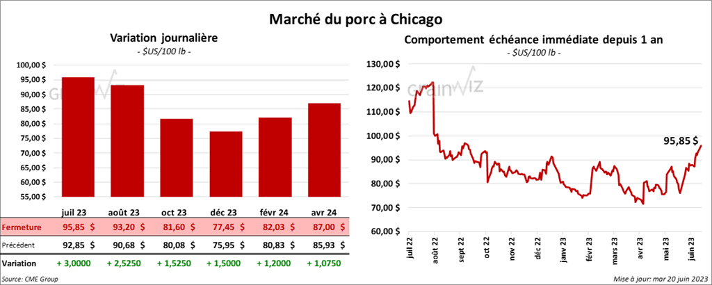 Le contrat de porc US juillet 23 a fini à 95,85 $ (+3,00 $). Celui août 23 a clôturé à 93,20 $ (+ 2,52 $) et celui octobre 23 à 81,60 $ (+1,52 $).