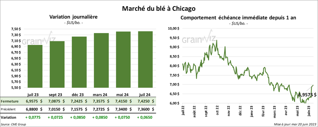 À Chicago, le contrat de blé juillet 23 a fini à 6,9575 $ (+7 ¾ cents), celui septembre 23 a terminé à 7,0875 $ (+7 ¼ cents) et celui décembre 23 à 7,2425 $ (+ 8 ½ cents) À Kansas, le contrat de blé dur rouge juillet 23 a fermé à 836,00 $ (-6 cents), celui septembre 23 fini à 834,40 $ à (-4 ½ cents) et celui décembre 23 a clôturé à 834,20 $ (-2 ¾ cents). À Minneapolis, le contrat de blé de printemps juillet 23 a clôturé à 849,00 $ (- 4 ½ cents), celui septembre 23 a terminé à 852,00 $ (-4 ½ cents) et celui décembre 23 a fini à 856,00 $ (-4 ¼ cents).