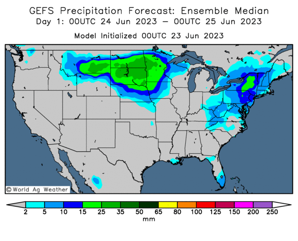 - Quant au NOAA, il prévoyait quelques précipitations pour la journée dans le nord des Plaines US et le haut Midwest. À plus long terme, pour le week-end, il anticipe des averses et des orages, surtout dans l’est du Corn Belt.