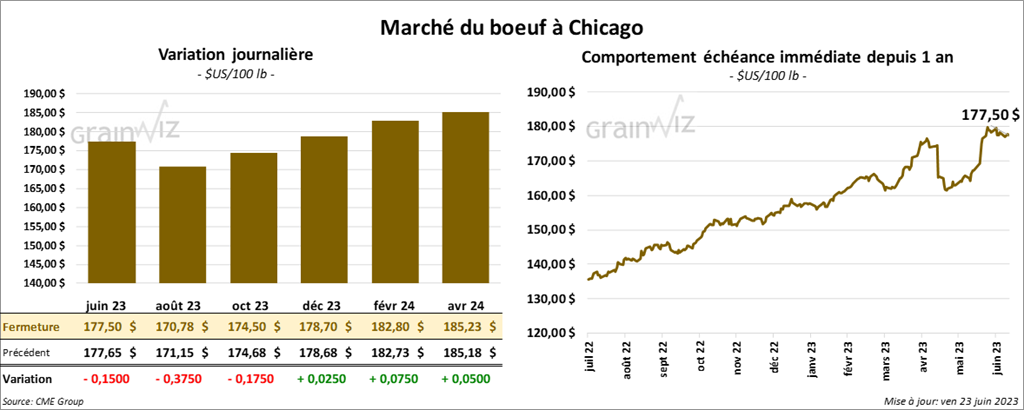 Le contrat de bœuf US juin 23 a fermé à 177,50 $ (- 15 cents). Celui août 23 a fini à 170,78 $ (- 37 cents). Celui octobre 23 a terminé à 174,50 $ (- 17 cents). Dans le cas du veau US, le contrat août 23 a clôturé à 253,950 $ (+ 3,27 $). Celui septembre 23 a fini à 237,700 $ (+ 3,17 $). Celui octobre 23 a fermé à 240,150 $ (+ 2,97 $).
