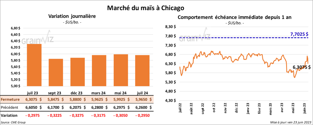 Le contrat de maïs US juillet 23 a fini à 6,3075 $ (- 29 ¾ cents). Celui septembre 23 a terminé à 5,880 $ (-32 ¼ cents). Celui décembre 23 a clôturé à 5,8800 $ (- 32 ¾ cents).