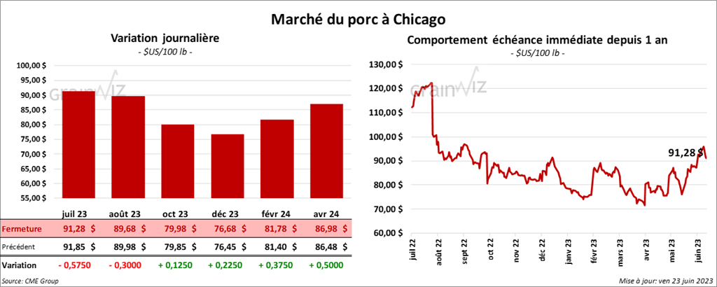 Le contrat de porc US juillet 23 a terminé à 91,85 $ (- 57 cents). Celui août 23 a clôturé à 89,68 $ (- 30 cents). Celui octobre 23 a fini à 79,98 $ (+ 12 cents).
