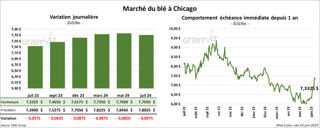 À Chicago, le contrat juillet 23 a fini la journée à 7,3325 $ (- 5 ¾ cents). Celui septembre 23 a terminé à 7,4650 $ (- 6 ¼ cents). Celui décembre 23 a fermé à 7,6175 $ (- 8 ¾ cents). À Kansas, le contrat de blé dur rouge juillet 23 a clôturé à 7,5900 $ (-12 cents). Celui septembre 23 a terminé à 8,6160 $ (-10 ¾ cents). Celui décembre 23 a fini à 8,6300 $ (- 10 ¼ cents). À Minneapolis, le contrat juillet 23 a fini à 8,6460 $ (- 15 ¼ cents). Celui septembre 23 a clôturé à 8,7360 $ (- 10 ¾ cents). Celui décembre 23 a terminé à 8,8020 $ (- 8 ¼ cents).