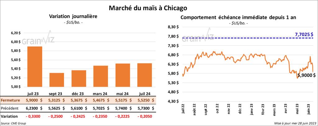 Le contrat de maïs US juil. 23 a fermé à 5,9000 $ (- 33 cents). Celui sept. 23 a clôturé à 5,3125 $ (- 25 cents). Celui déc. 23 a terminé à 5,3675 $ (- 24 ¼ cents).