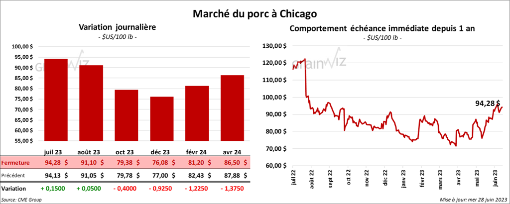 Le contrat de porc US juil. 23 a fini à 94,28 $ (+ 15 cents). Celui août 23 a clôturé à 91,10 $ (+ 5 cents). Celui oct. 23 a terminé à 79,38 $ (- 40 cents).